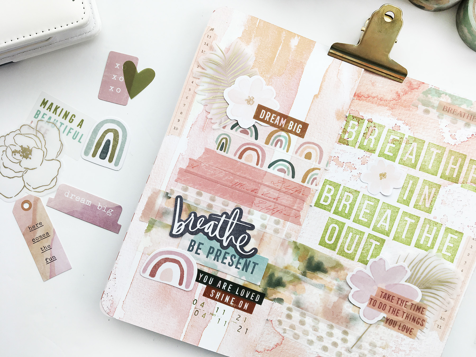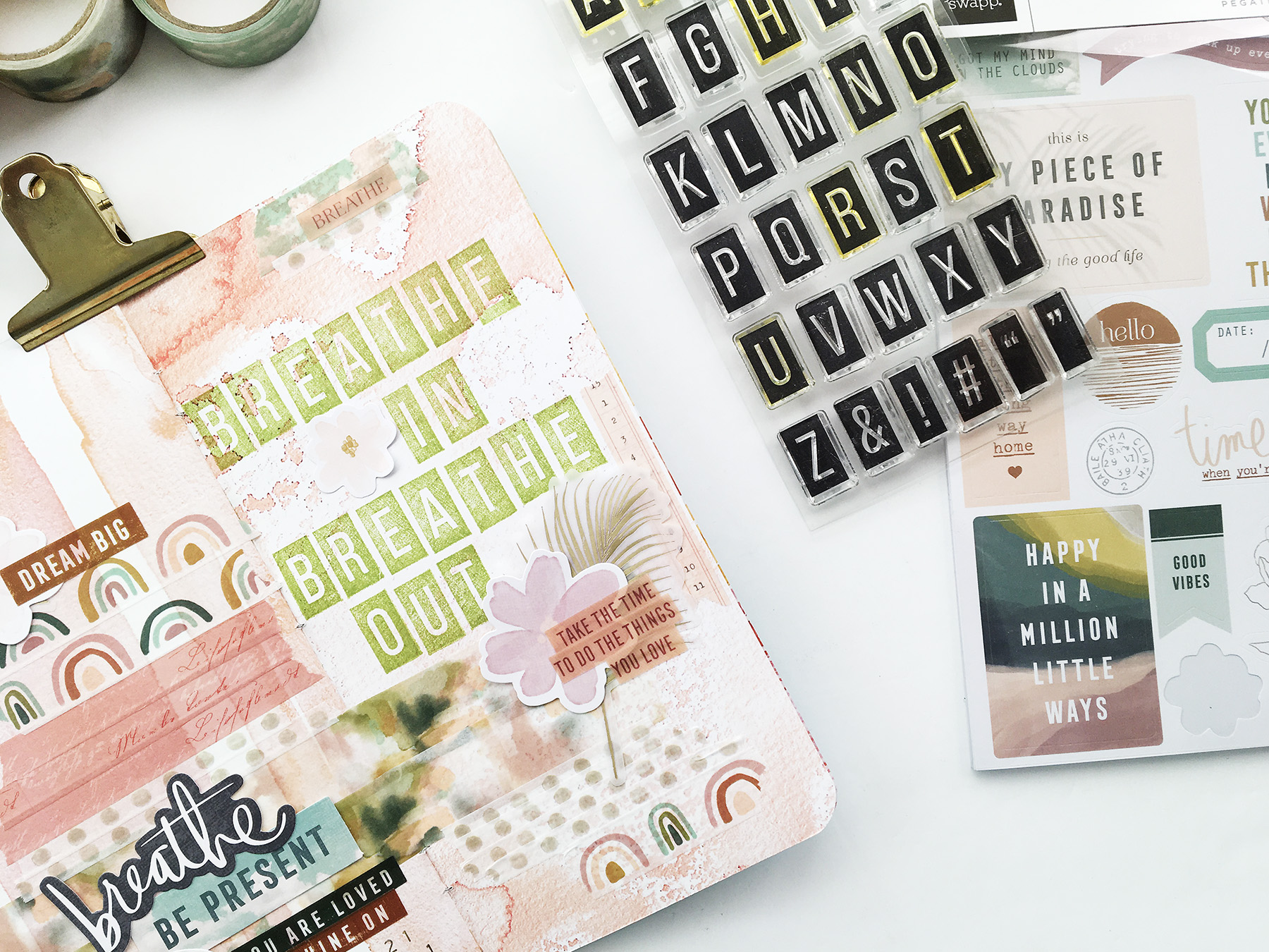 Once all the washi is in place, I found I had a great backdrop for my title and other pretty elements that expressed the meditation in my mind. My stamped title reminded me to breathe in, breathe out, and while you do that, simply listen to the silence. The soft sound of your even breath calms, while hands are busy with paper + adhesive. I also used those gorgeous vellum branches for just a bit of bling.