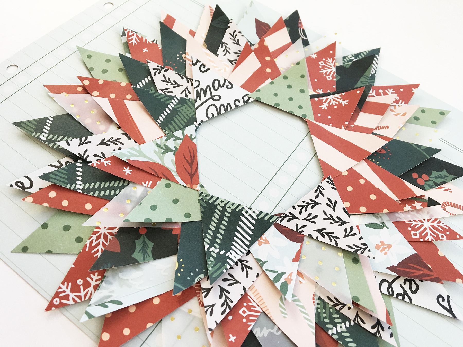 I couldn’t believe how beautiful this page turned out! It was a bit of a job punching all the triangles, but the end result was more than worth it! I chose a variety of colors and patterns for the wreath, and used both A-side and B-sides. Once I had them all punched, it came together so quickly. I had created a series of concentric circles using a good old faithful protractor. That formed the base of my wreath, and then I adhered those triangles around the circle over and over again.