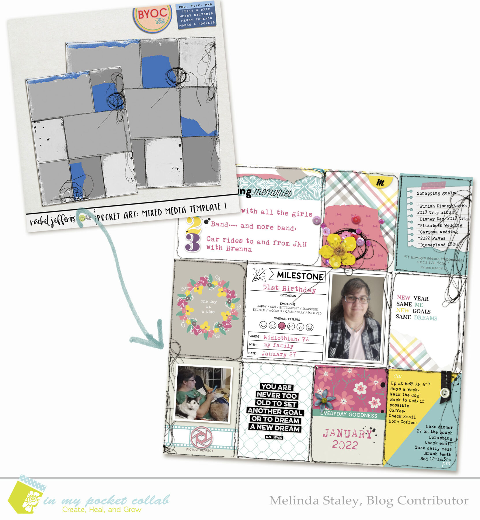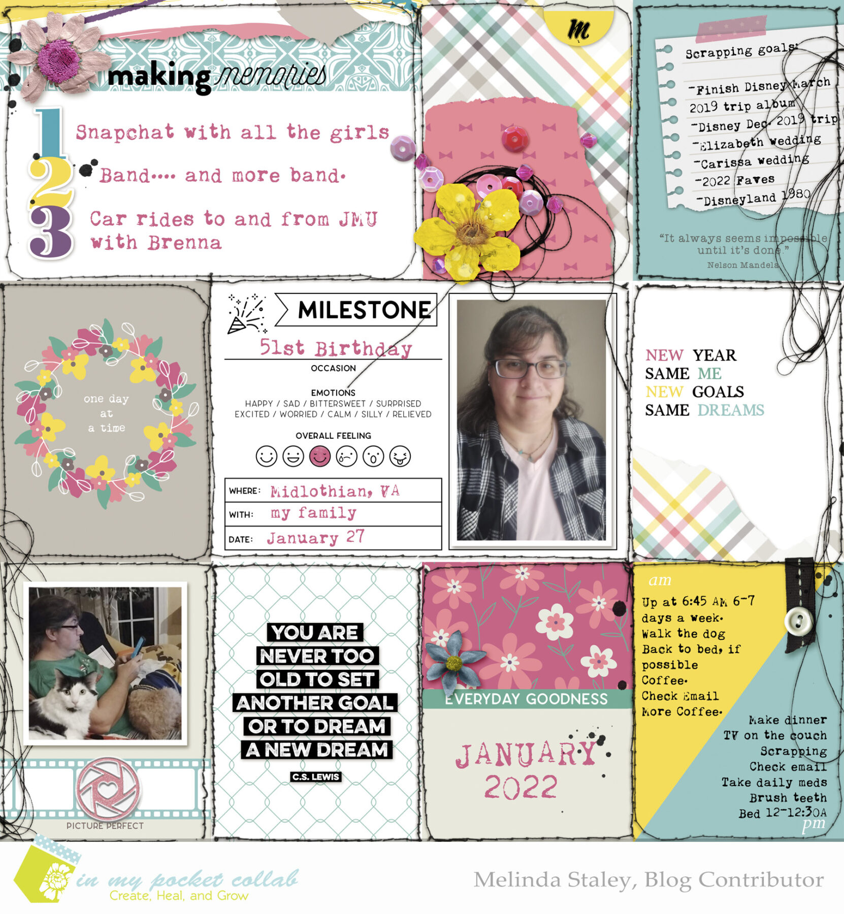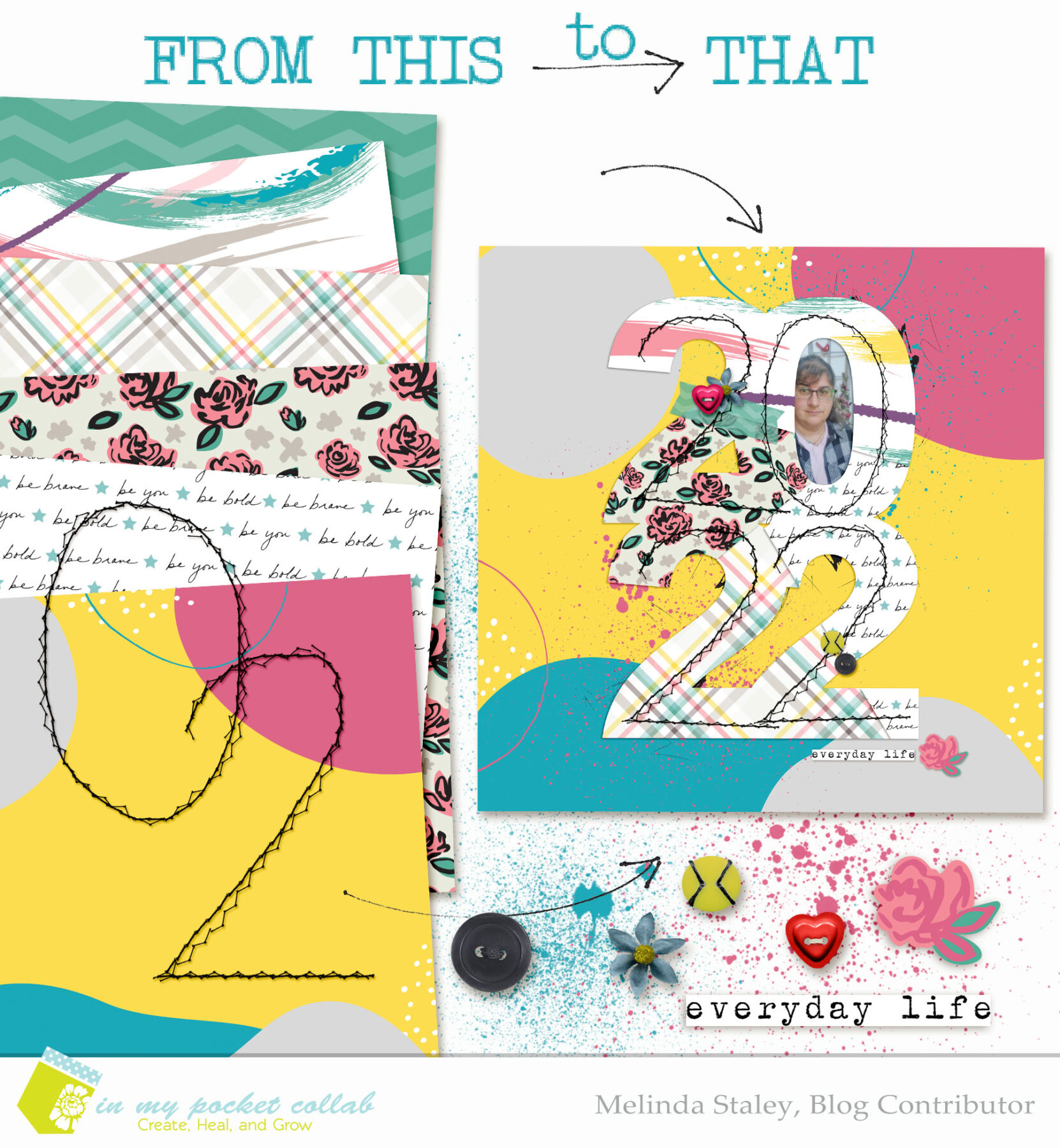 This year, I started with the cover. I played with the papers in the IMP Life Stories Collab and just started putting some of them together in the 2022 album cover template by Scrapping With Liz that she offers free on her blog. After placing the papers and clipping them to the number pieces, I added some stitched numbers so the cover matched the page templates I plan to use. I pulled and tweaked the corners of the stitches layers with the transform tool to make them fit the shape of the numbers a little closer than the way they were originally designed – closer is good enough in this case and they don’t match exactly either giving it more of a ‘handmade’ feel. The washi tape piece on the template is dressed up quickly with a bit of paper added to it. Adding just a few buttons, and a sticker and a little word strip from the kit keeps the focus on those big beautiful numbers with my photo peeking out.