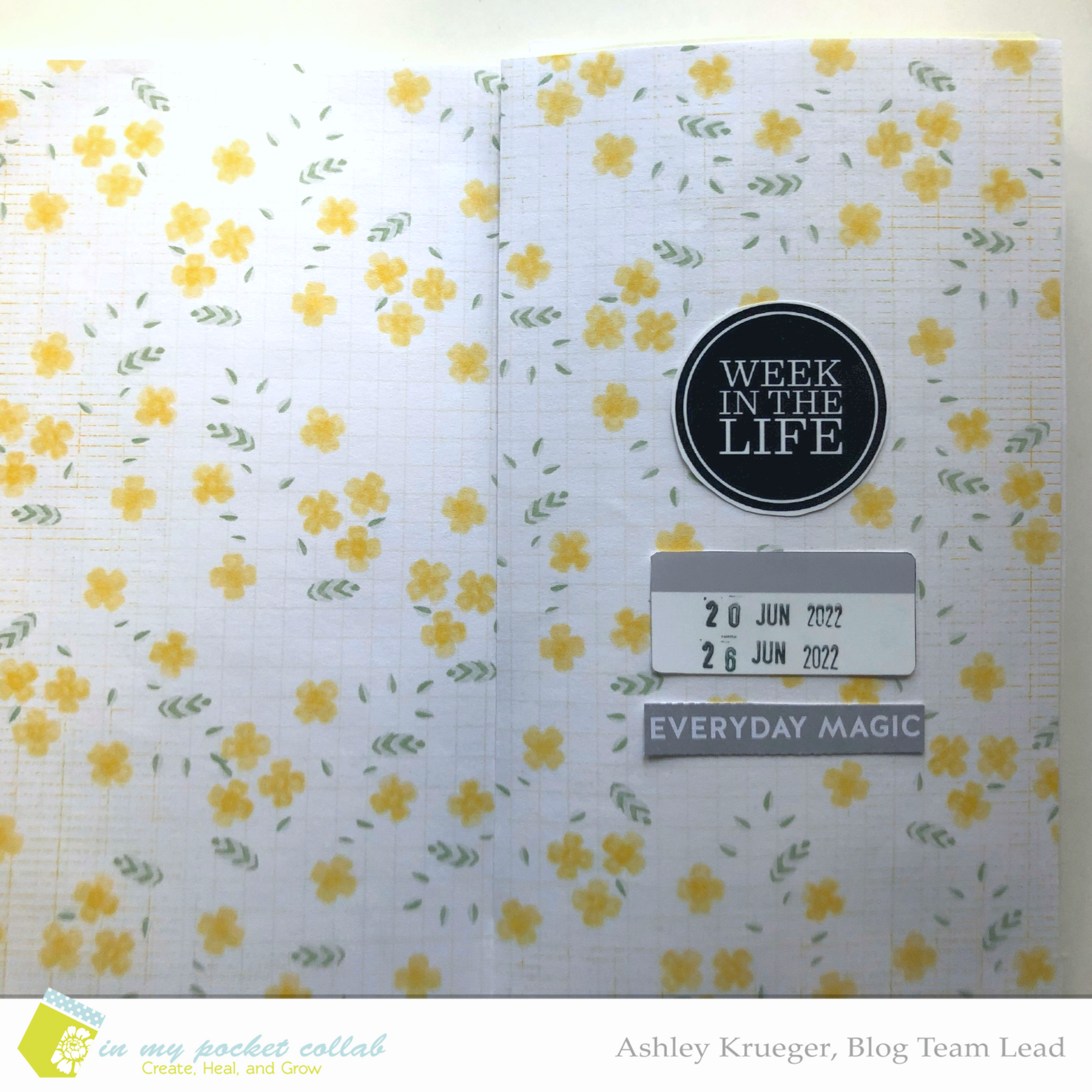 I decided to add my Week in the Life into my Little Summer Joy Travelers Notebook. To separate it from the rest of my summer, I started with a title page using this lovely floral paper from the kit. I printed it so that I would have the distressed ledger paper detail on the edge of both sides of the spread. Then I embellished the right hand side with a Week in the Life diecut and a perforated word strip from my stash and used a label from the IMP Go To Techniques Collab Kit.