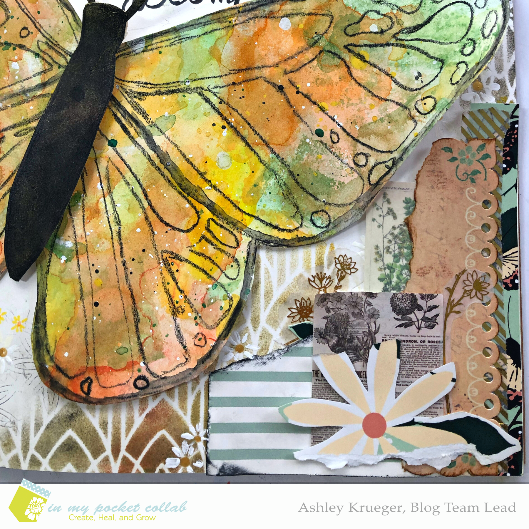 Typically, when I am creating an art journaling page, I draw inspiration from the feelings or emotions. This time, I was inspired by the color palette and butterflies in the Paper Hum Co. Rising Up journal card collection. I don’t often use yellows and oranges but once I saw this collection, an idea came into my head and I had to try it.