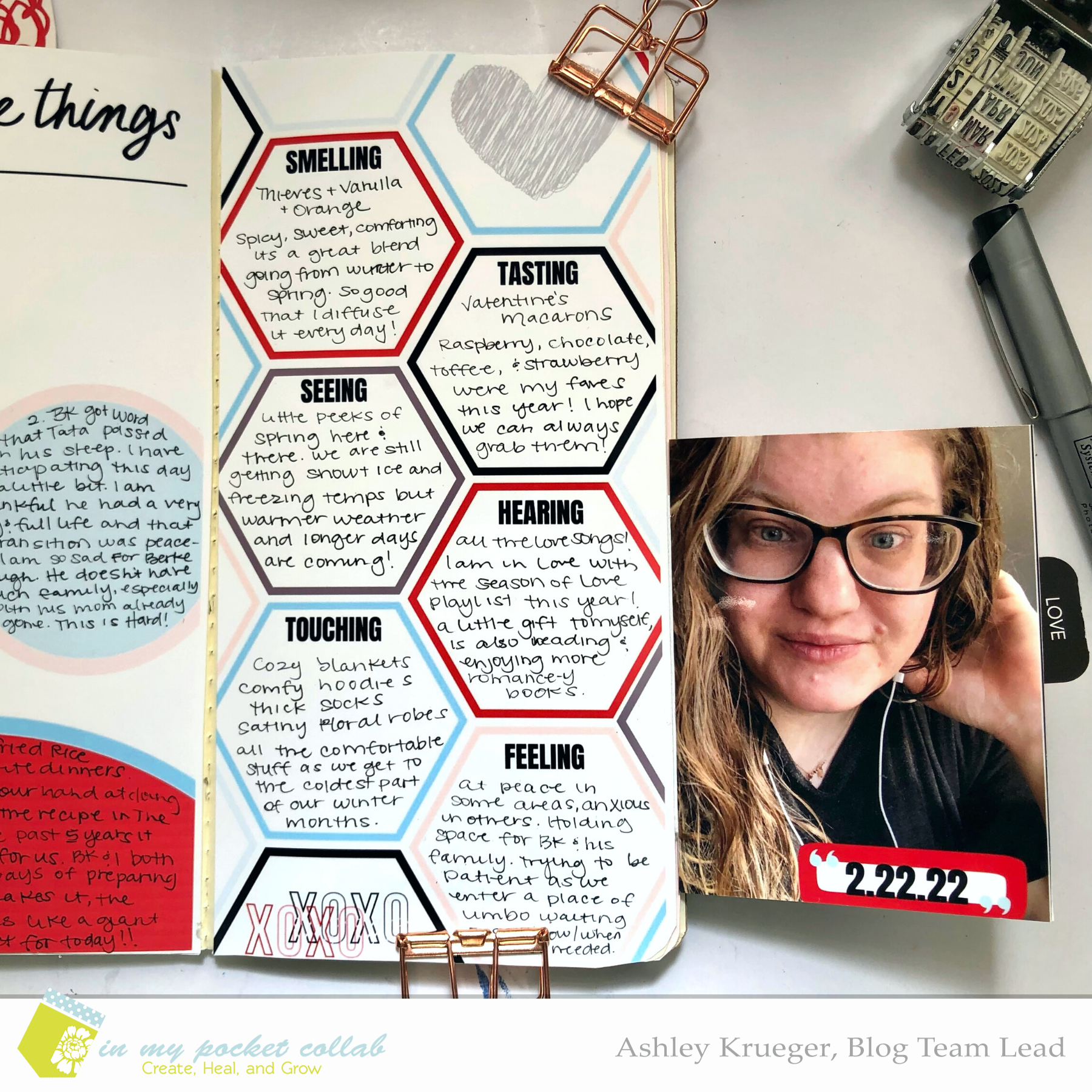 I used the Reflect prompt as a place to use one of Meg’s Challenges from the IMP Life Stories class. She created the cutest printables for documenting Where I Stand/5 Senses. I loved the printables but they are from the IMP Life Stories Kit and didn’t quite match the colors for the Love You kit so I used it as a template to make my own paper. You can see a better look at how I did this in the process video below. After getting all the hexagons in place, I used some of the digital die cuts to embellish.