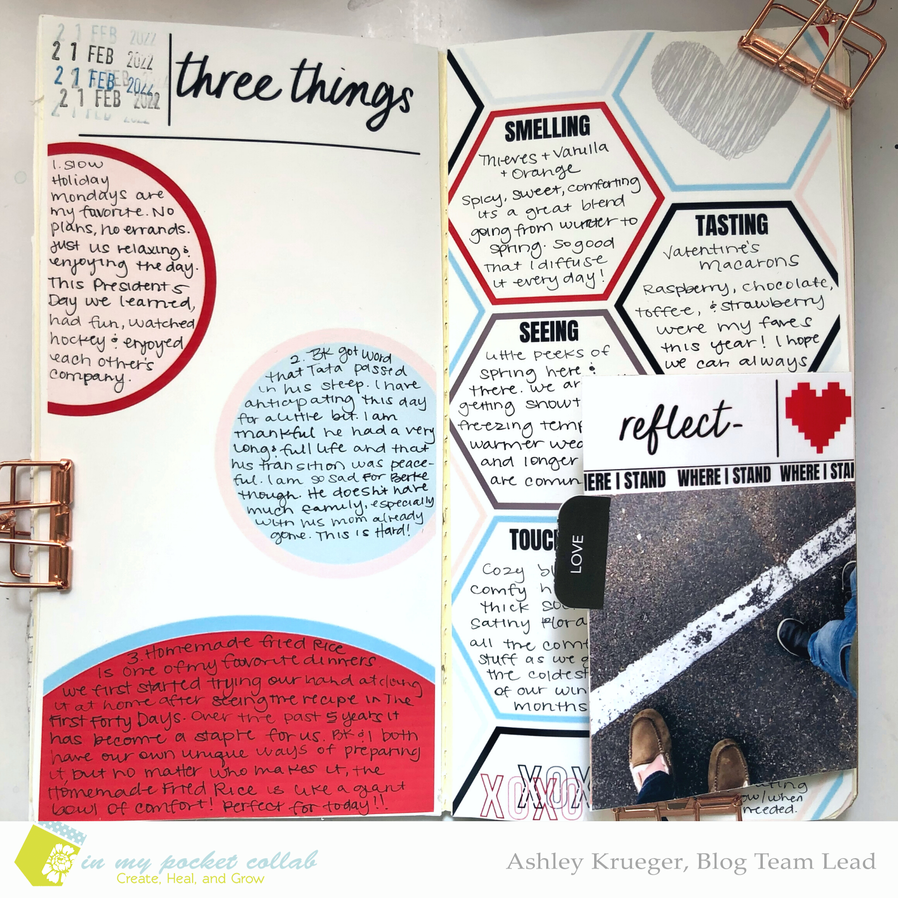 Next, is the spread for the prompts 3 Things and Reflect. For the 3 Things page, I started with another journal card in the kit. It had the red semi circle at the bottom. Before printing, I added two more circles in coordinating colors, as well as title banner and word art. Then I wrote out my three things.