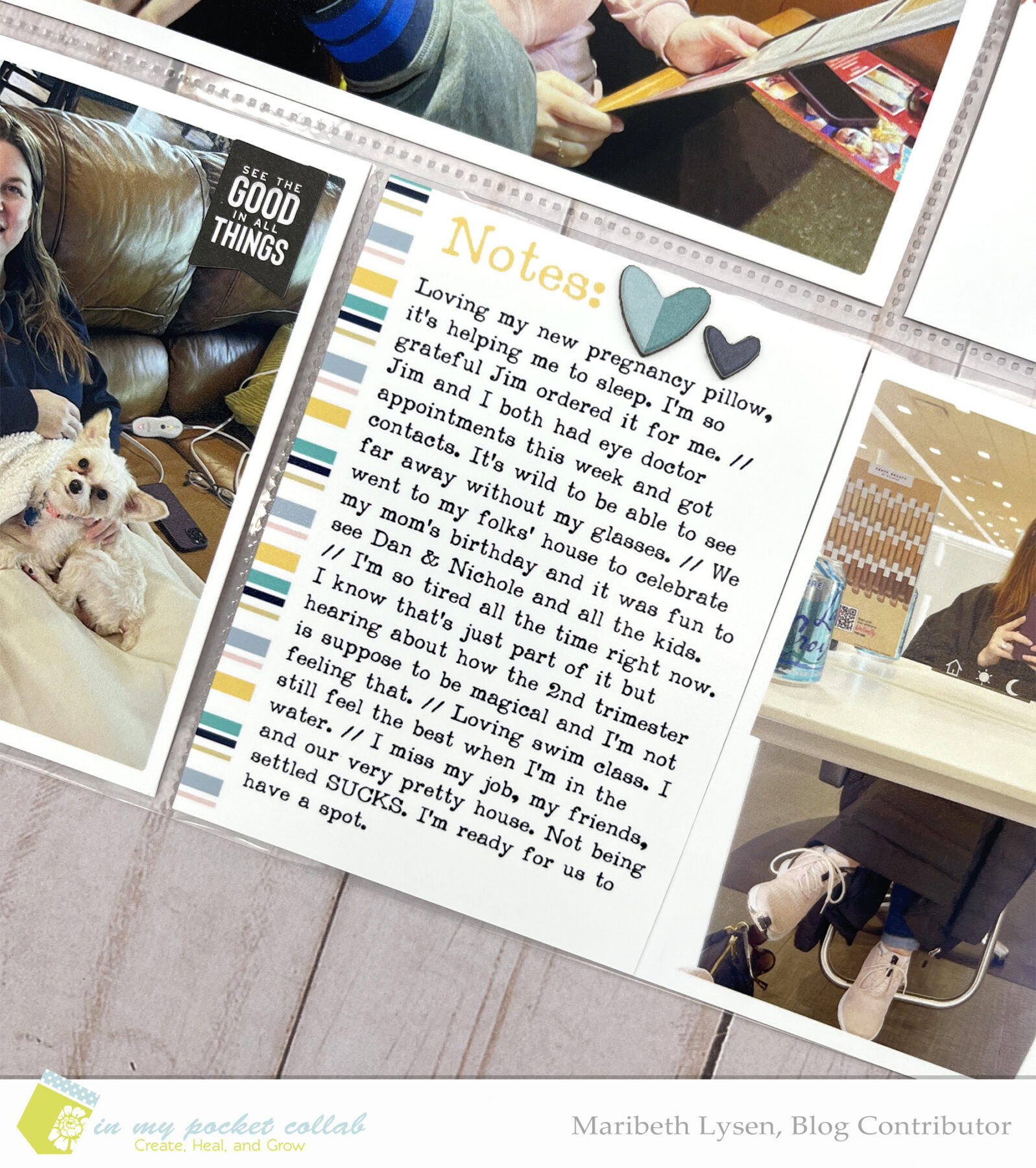 I used the 3×4 journaling card to do my weekly roundup of what happened that week. Using that same KG All of Me font to make the title “Notes” on my card look like stamping. This time I used the color picker to select the same mustard yellow from the collection for my font color. I used a typewriter font for the main journaling to keep things easy. Once the card was printed, I added 2 chipboard hearts from Studio Calico.
