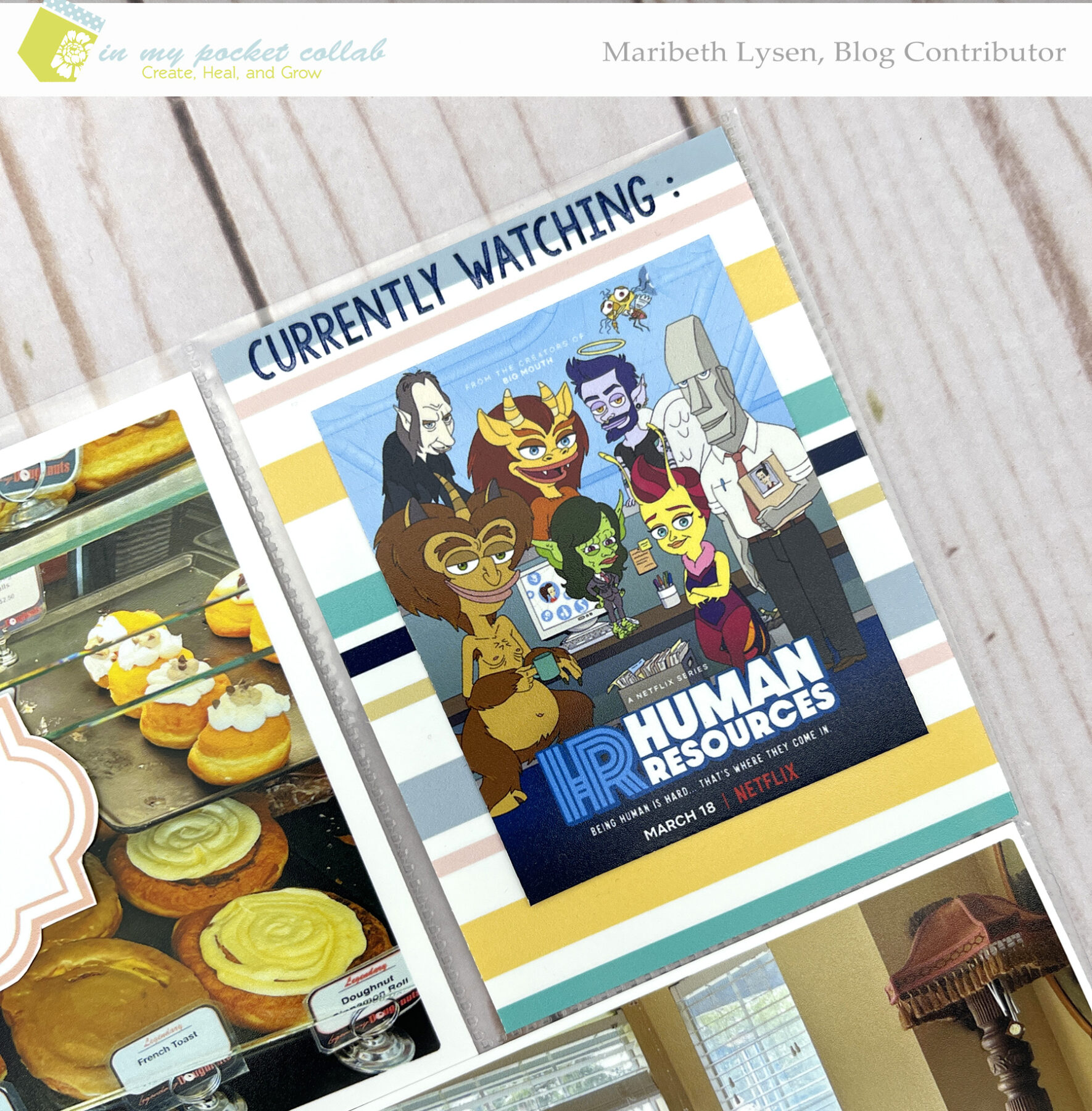 One thing I love to do when working hybrid is print out the different digital layers separately. That way, I can layer them in real life once I print everything. This helps give my layout depth and dimension. I did that on this spread with the “Watching” journaling card created using part of the stripped 12×12 paper #4 from the collection placed on a 3×4 spot. I used that same “KG All of Me” font, this time in the same navy blue as the collection, to add the “Currently Watching” to the card. Then I printed out the card. I took the screen shot of the show were were watching that week, Netflix’s Big Mouth spin-off show “Human Resources”, and printed out the screen shot separately. After both pieces were printed, I glued down the screen shot of the show to the journaling card I printed out.