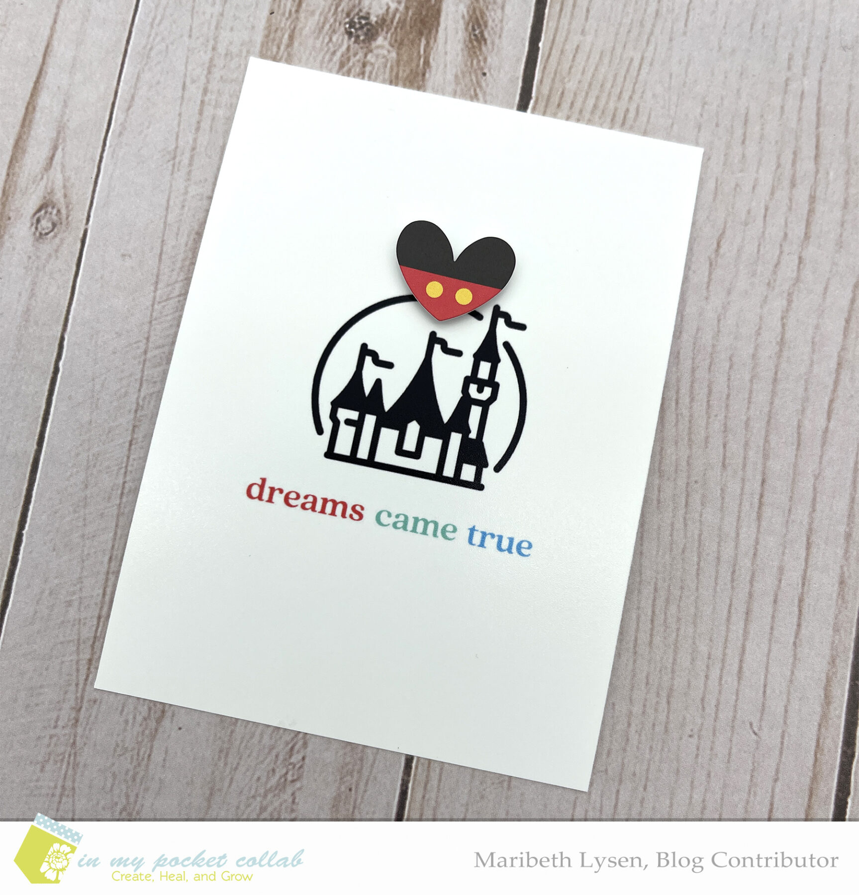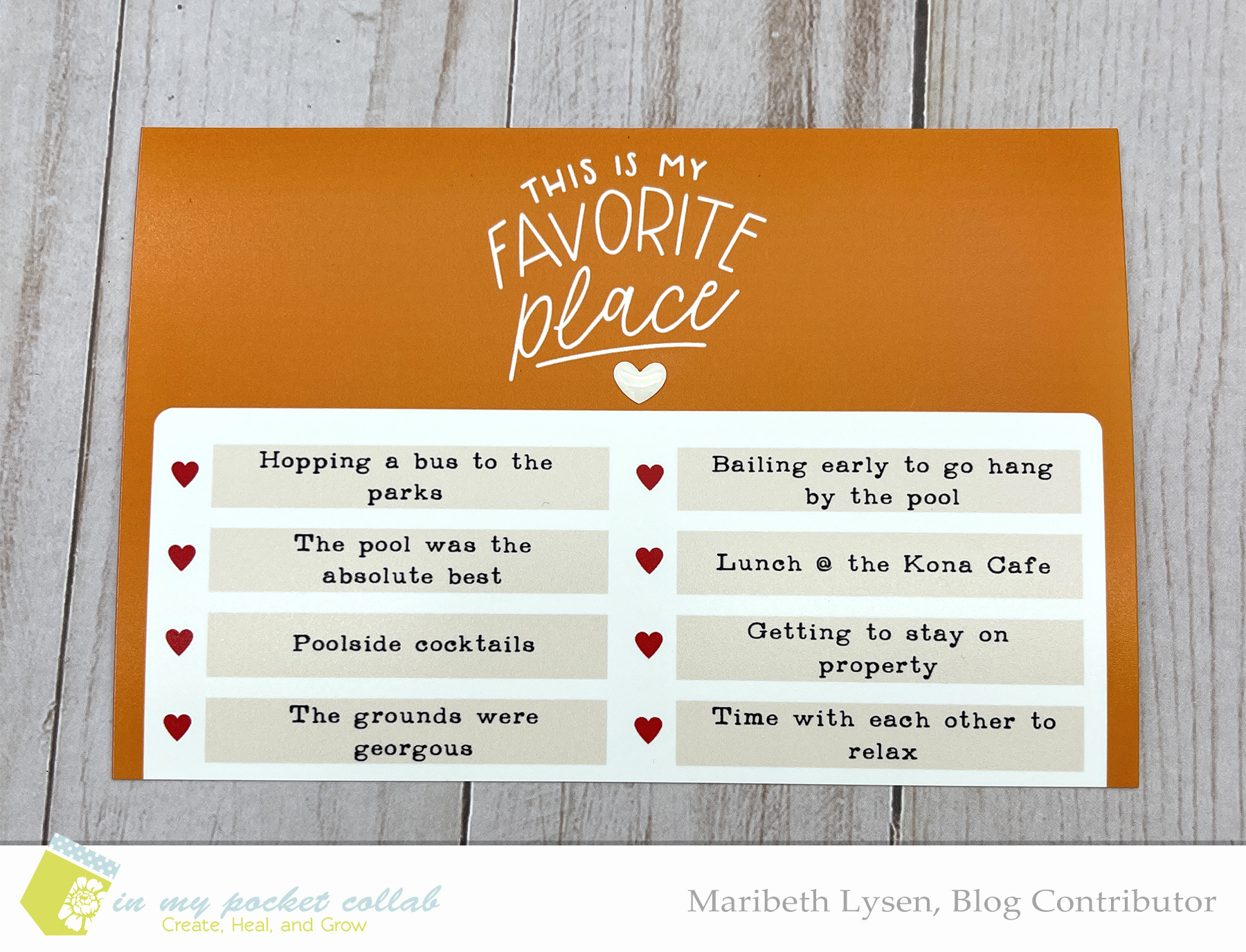 I love a good list journal card and used this one from the collection to write out my favorite things. I’d jotted down a few notes during the trip and it was great to go back and reference what were some my favorites about our hotel. The pool at the hotel was wonderful, and a great way to escape the crowd at the parks. Hanging by the pool is one of my absolute favorite memories of the trip. After I added my journaling and printed the card, I added another Doodlebug heart and slipped the card in the pocket.