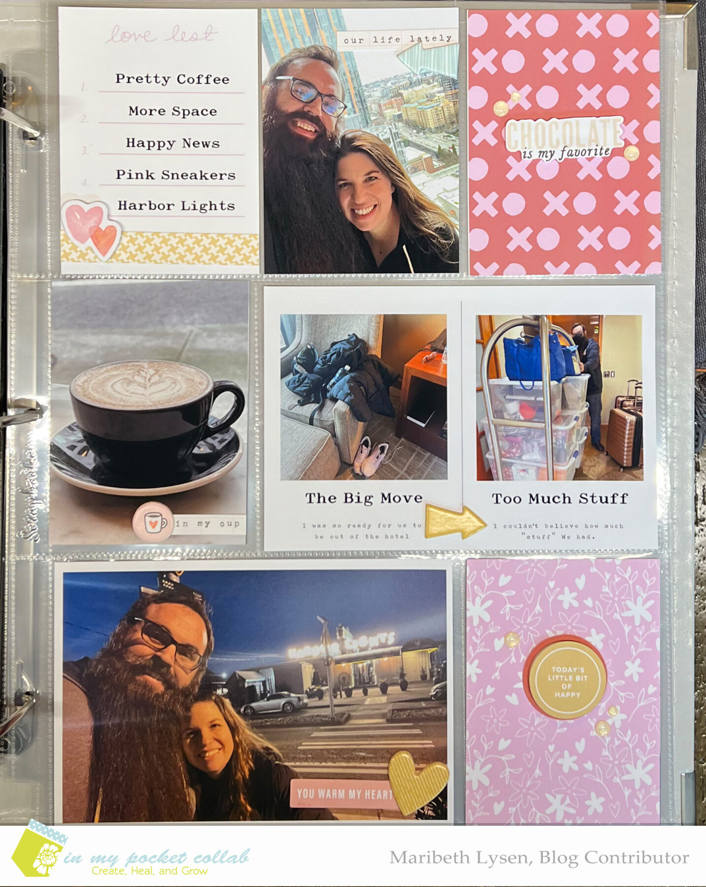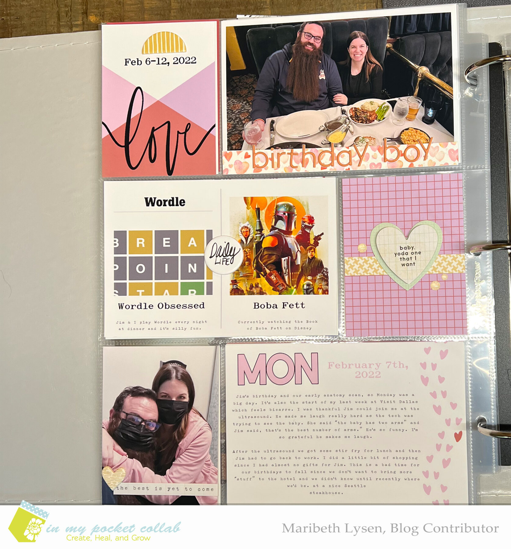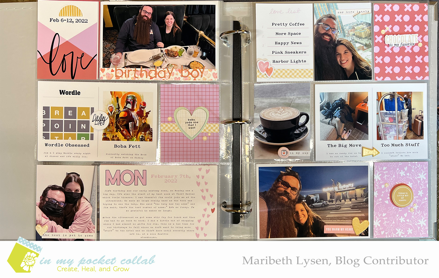 Hi everyone! Maribeth here and I’m continuing with the “Making Pages” theme from the In My Pocket Collab Class. I got to work on week number seven for 2022. I skipped ahead, so I’ll need to go back and finish up the last 2 weeks in January at a later date. I typically skip around in my albums and work with whatever photos or product are inspiring me right now. For me, that was week seven because this week was fun to put together. Jim’s birthday was Monday and we moved out of our hotel suite and into a much larger temporary rental house for the next couple of months. I’m so happy to have space again!