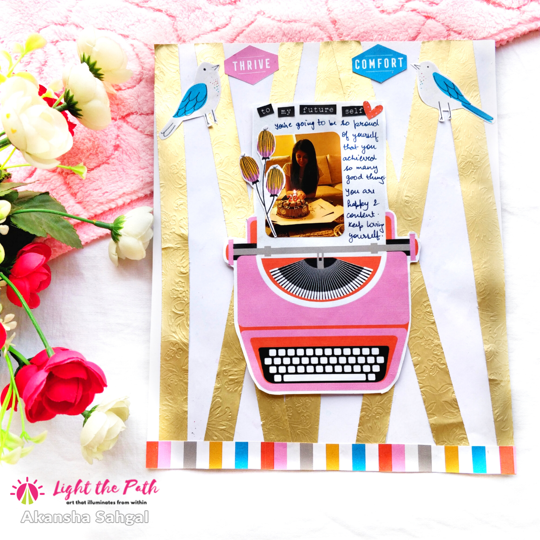 Now I just wrote down my message and once done I added the typewriter in the center with some foam tape. The foam tape really helped the typewriter to pop and shine from the busy golden background. And yes to tone down the gold and bring some cohesiveness in the layout I added a washi strip from the kit on the bottom part of the sheet. I hope you liked this layout and feel inspired to talk to your future self and tell them how strong they’ve been this whole time.