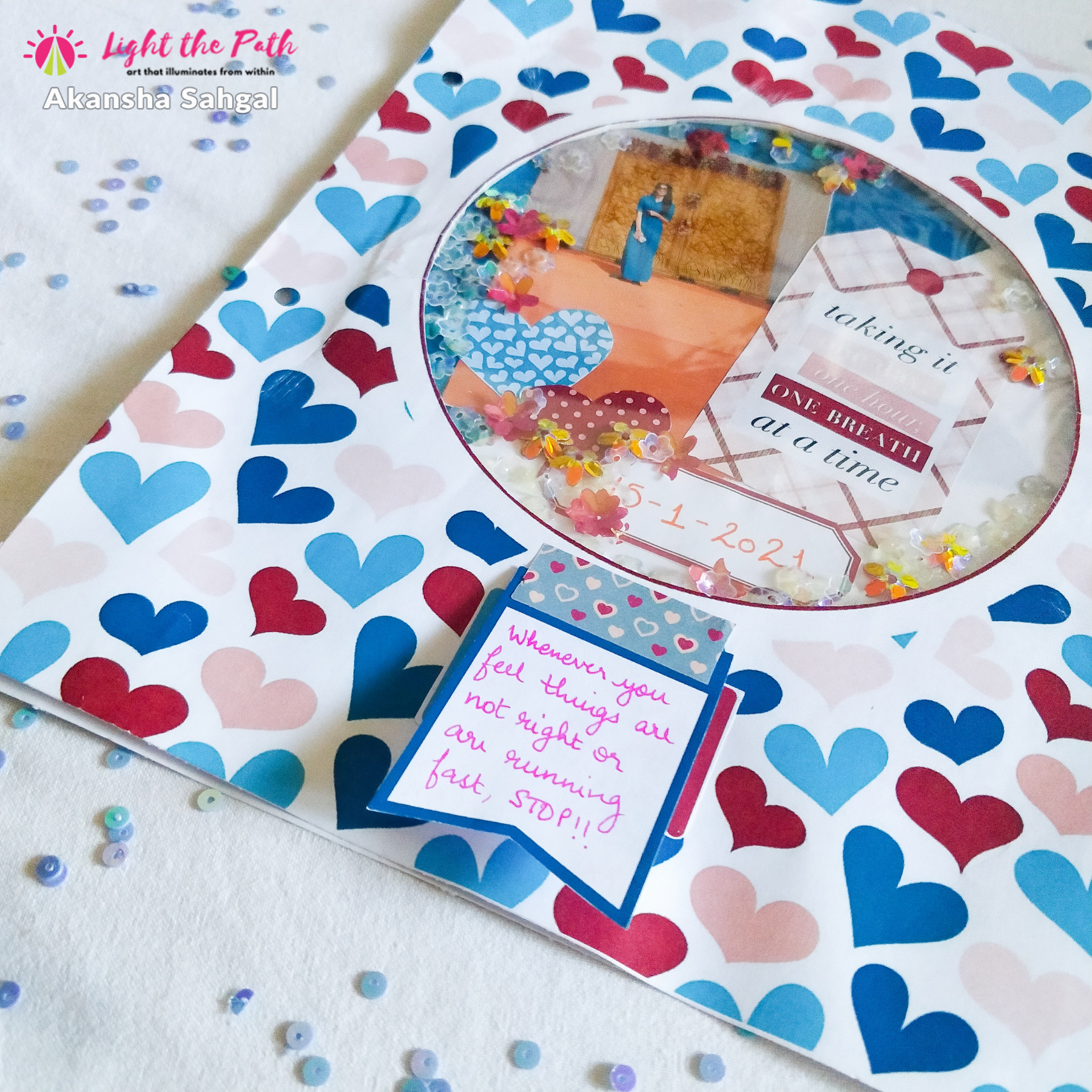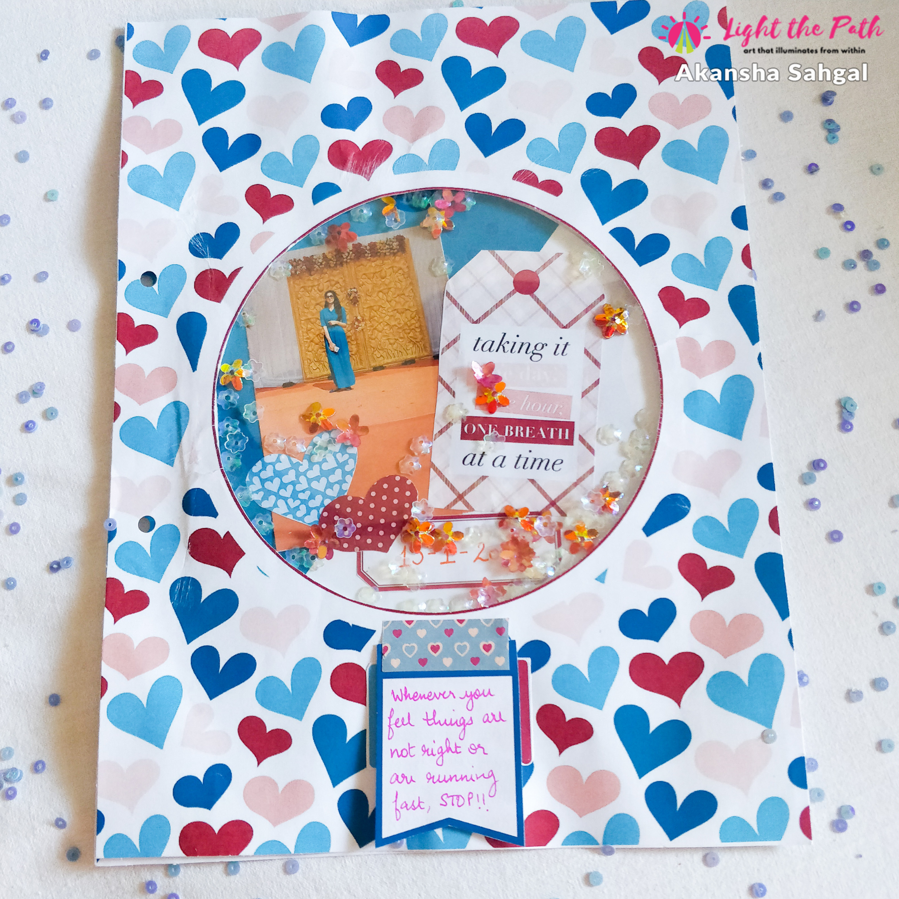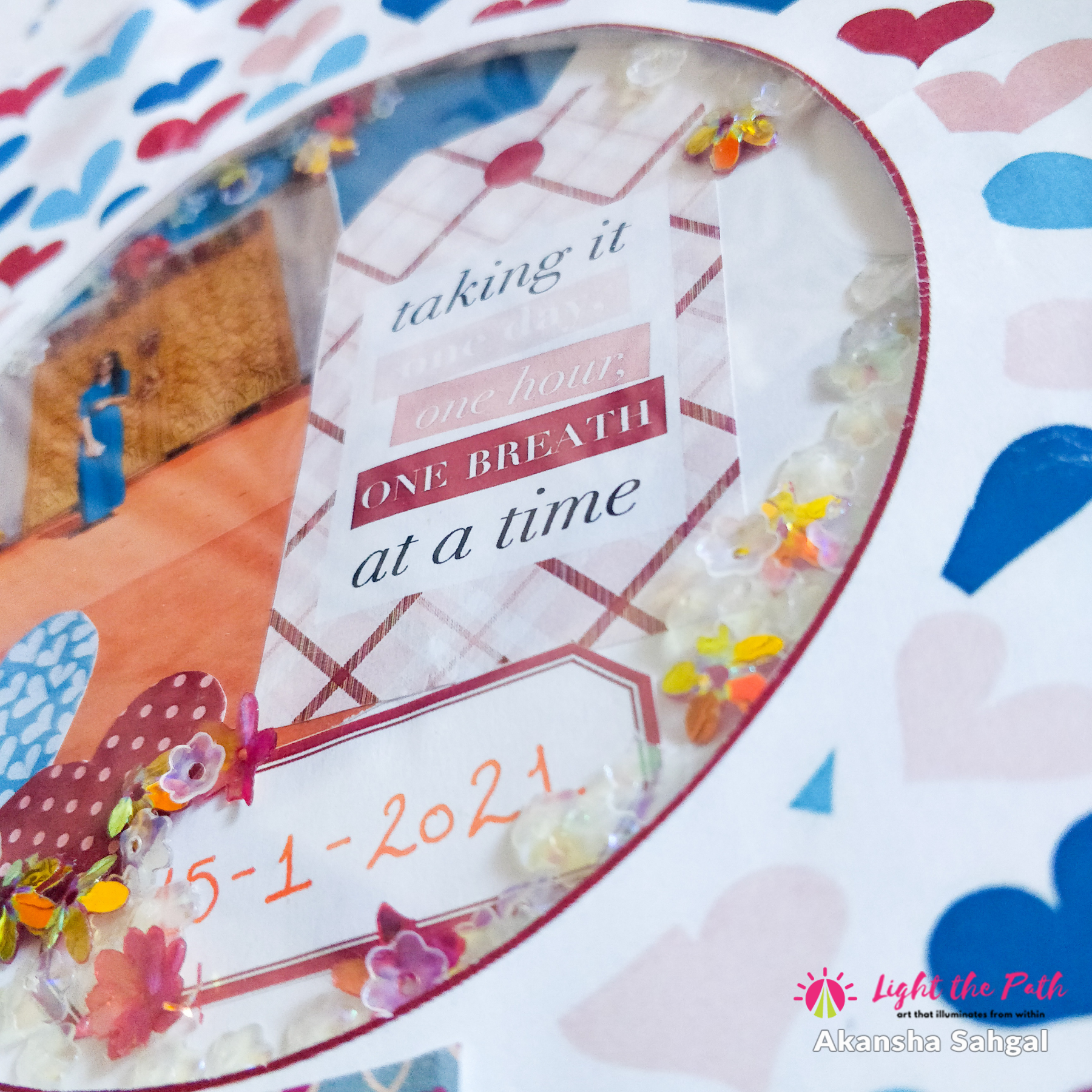 Then I placed the heart sheet on top of the other and went ahead to see the placement of the photo and other elements from the kit on the base sheet. I decided to use the tag from the kit that said “taking it one day, one hour, one breath, at a time”. I also cut out some hearts and then completed the whole thing with a banner on which I wrote down the date of when I made the layout. Once I was happy with the whole layout, I went ahead and pasted everything down.