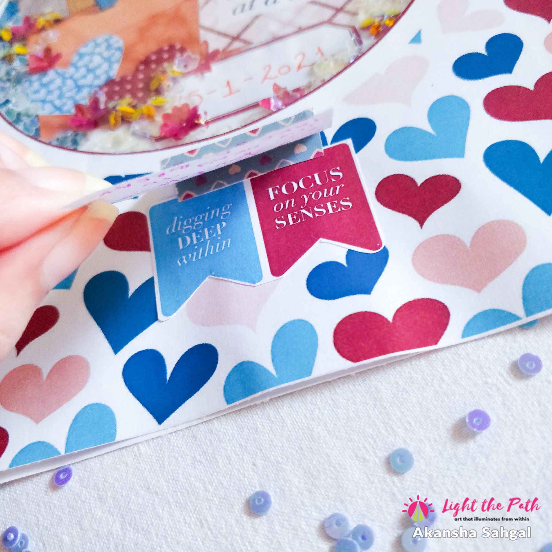 I am Akansha Sahgal and I am back with a layout inspiration from the February Light The Path workshop. The kit that was designed by Traci Reed had some really beautiful journal cards in it. And the one with the hearts and a circle in the center just caught my eye and I knew what I had to do with it. I started of by printing out that journal card along with one more journal card to use as the base on A4 size regular copy paper. Then I trimmed them down according to the size of the journal as well as cut out the circle from the center.