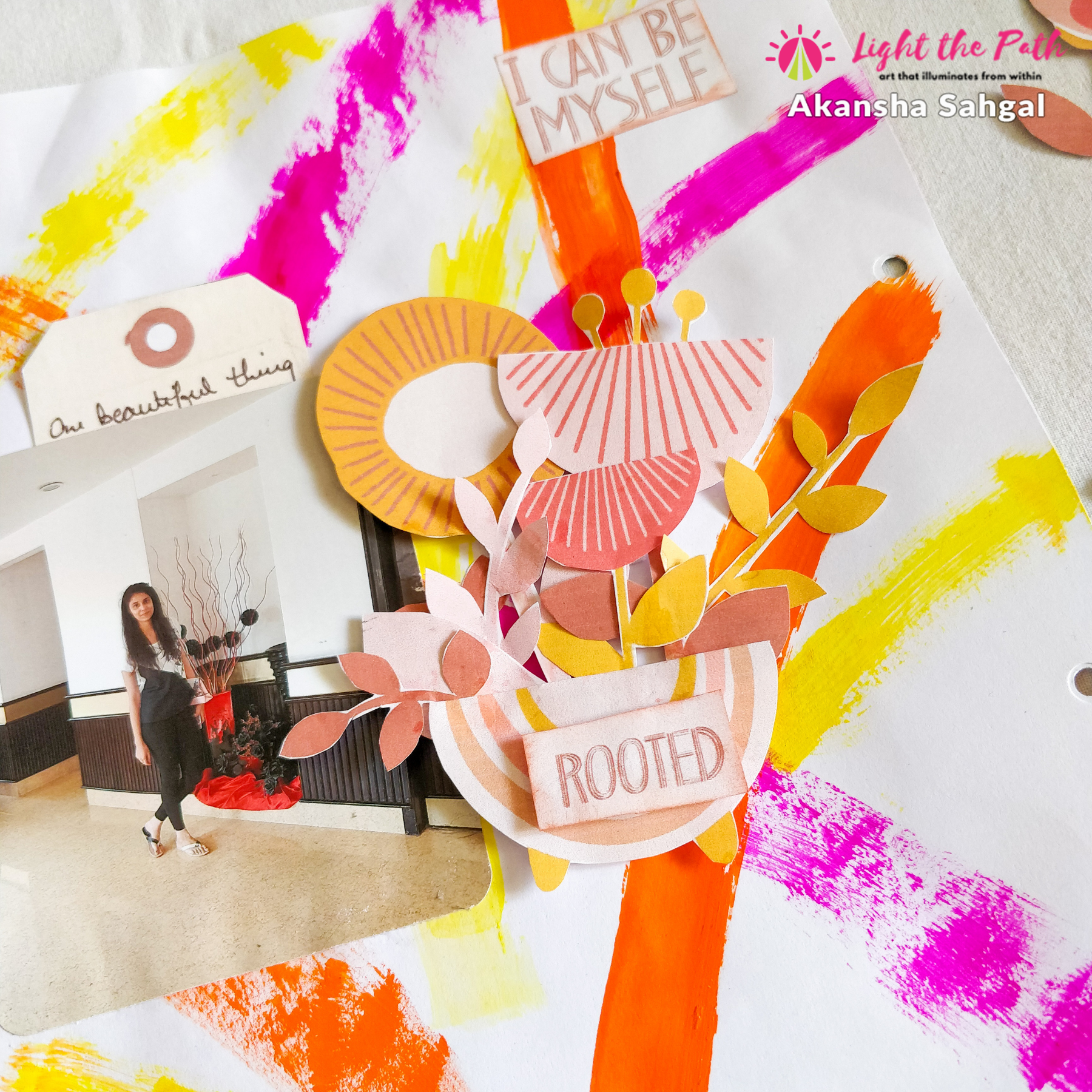 So it was time to create some fun background on my own. I really liked one of the journal cards that had a paint stroke design on it. So I tried recreating that for my layout using some acrylic paints. Then I went ahead and cut out some flower and other embellishments. This time I decided to glue my photo as a pocket so that I can add my tag with journalling in that. After adding the photo I went ahead and made a cluster of flowers in a vase. Also, I added the “rooted” sentiment on the cluster as it went perfectly with that. I used the sun embellishment as a label to write down the date of the layout.