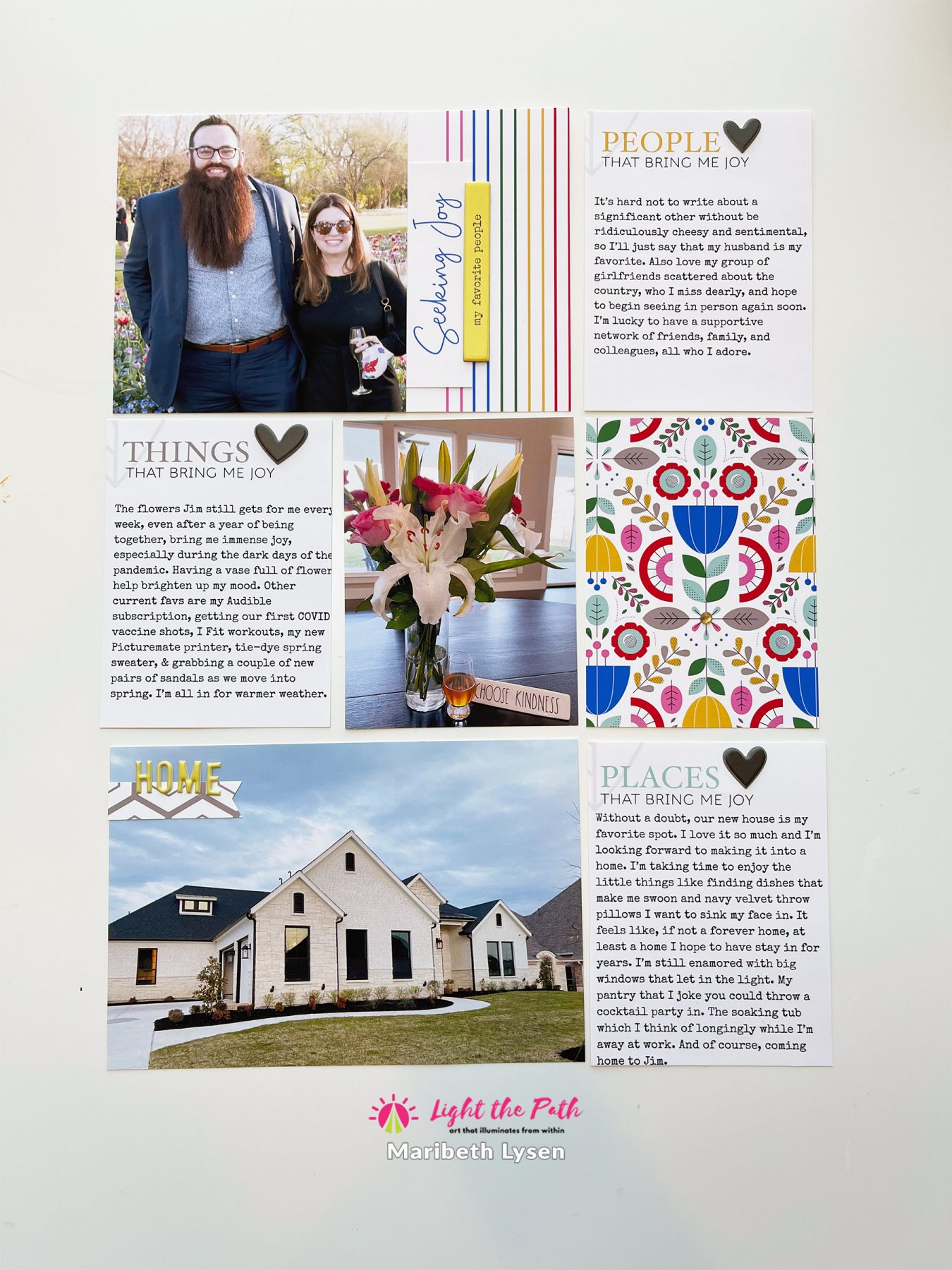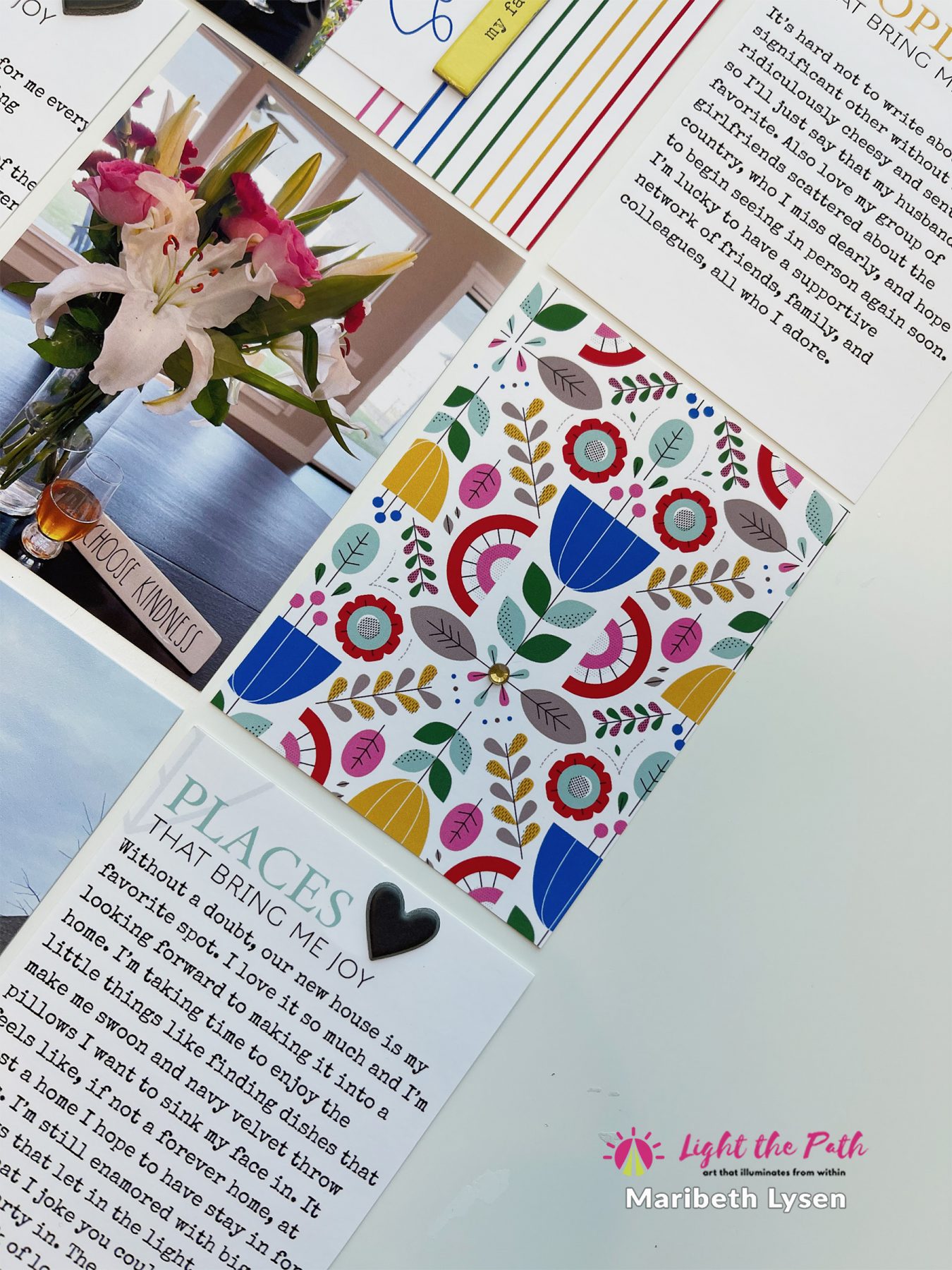 For this month’s lesson, I used the journaling cards to fill in each prompt. I picked my two favorite filler cards from the beautiful collection by Meagan Johnson, the rainbow stripe and the this delightful floral to round out my paper needs.