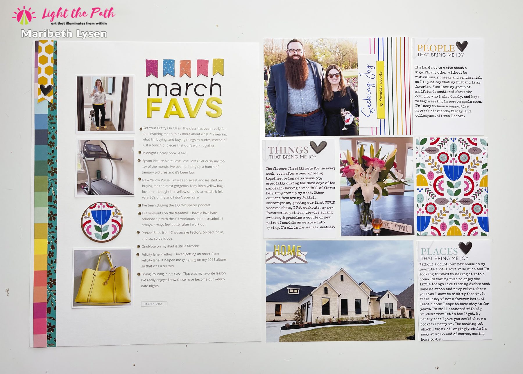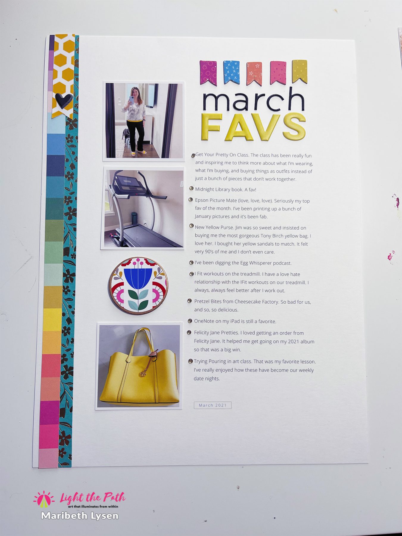 For the opposite side, I listed out my 10 current favorite things. Doing 10 things every month as a 9×12 layout is something I’m doing for each month this year. It’s been a fun project and helps me connect to the things I’m loving in any given month. It’s also fun to see the changes over time in what I’m loving and what stays month after month. I incorporated a few physical supplies from stash including Lawn Fawn, older Paige Evans collections, ands some letter stickers from Felicity Jane.
