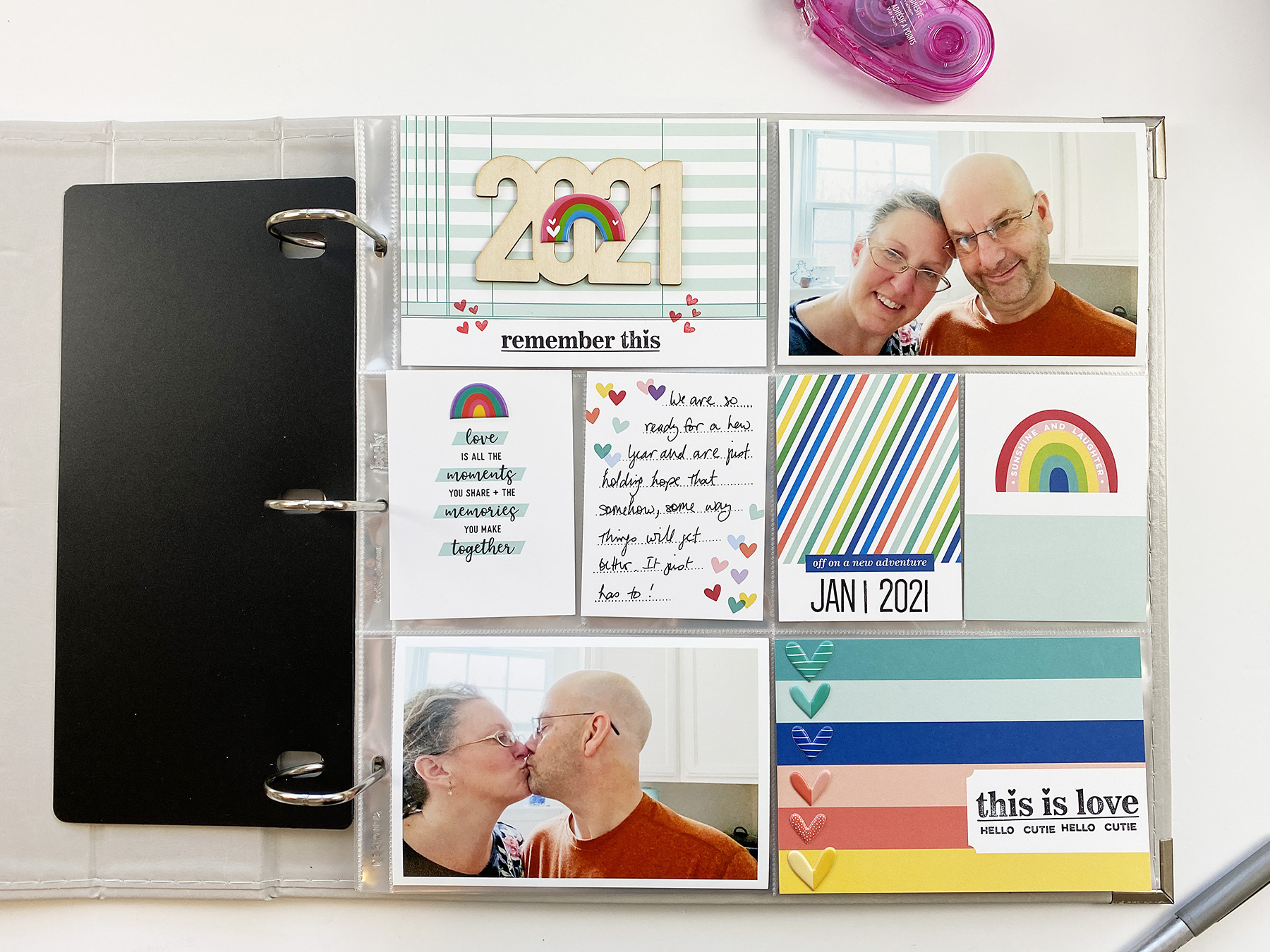 I’ve lost count, but there are quite a few rainbows on this layout. My favorite card is the one at the bottom, with all the colorful lines across it, and the puffy hearts layered on top. Color for color, so much fun texture, make that so happy! I also loved adding the stamp directly to the card, this is love, and the hello and cutie across the bottom. We are still quite the love birds. Nothing will ever take that away from us!