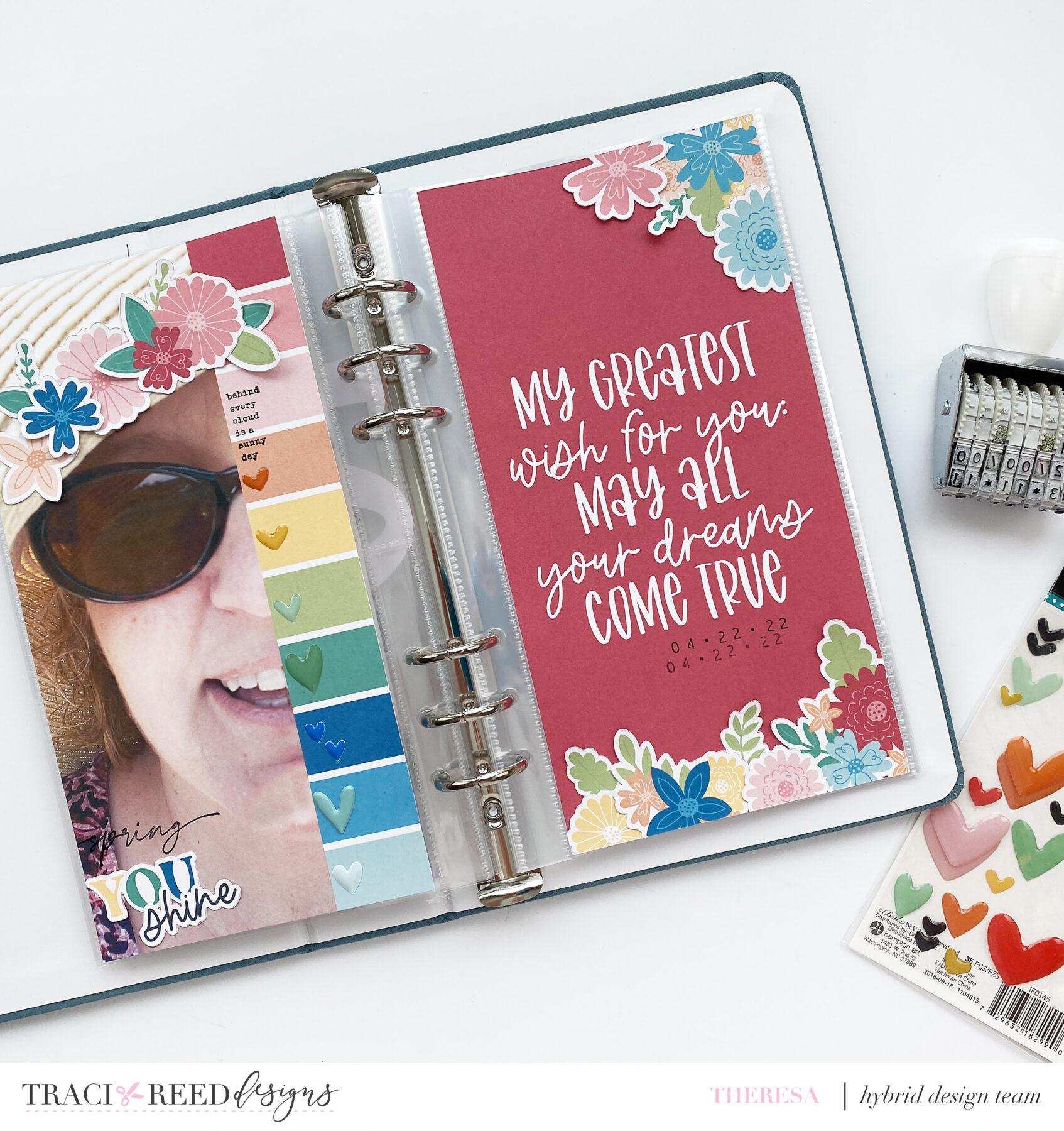 Hi friends, it’s Theresa here and today I wanted to share the creative team work I have been doing for Traci Reed Designs! I have been asked to be Guest Designer for May, June, and July, which is such an honor because Traci is such an incredible product designer and she inspires me so much! I came to appreciate Traci’s work way back in 2016 when she was on the Gossamer Blue team creating papers, stamps, and stickers for their monthly kit subscription. I still miss their kits! She has gone on to work with so many other amazing companies in our industry, and also is building her own empire over on her own site. Her May release was called Happy Day, which is just an incredible kit designed for celebrations, birthdays, and pretty much any happy day you can think of to document. Today I wanted to share the layouts I created with that collection, along with a process video for the traveler’s notebook layout you see above. Check it out below.
